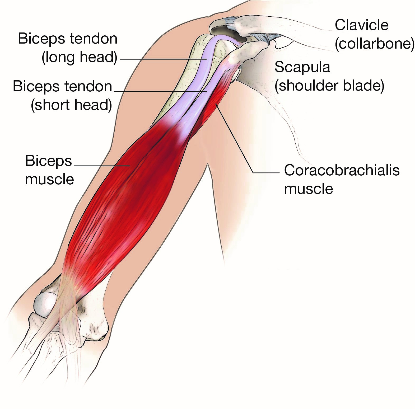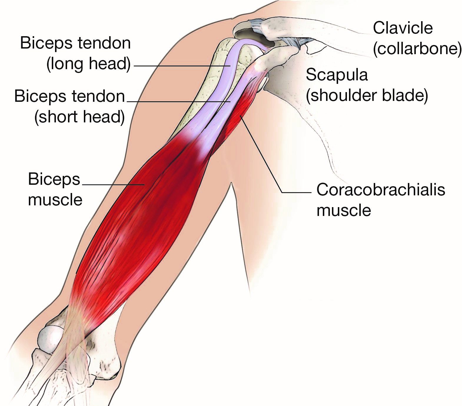 The biceps muscle lies in the front of the upper arm and has two tendons that attach it to the shoulder: