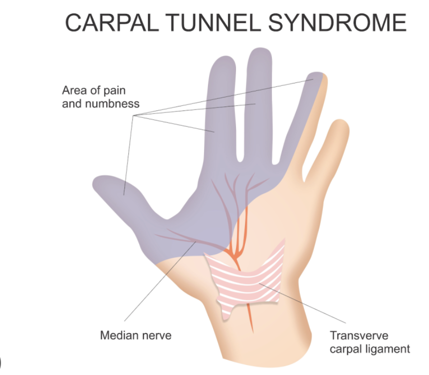 - Whole-hand paraesthesia: Many patients describe diffuse hand numbness that does not respect strict median nerve distribution — this ‘glove’ distribution does not exclude CTS