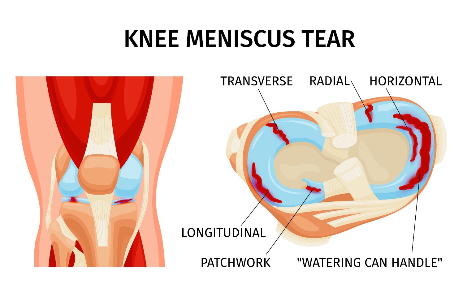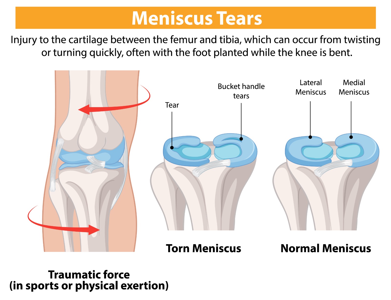 The menisci are two C-shaped fibrocartilaginous discs — the medial and lateral meniscus — that sit between the femur (thigh bone) and tibia (shin bone) within the knee joint. They act as shock absorbers, load distributors, and stabilisers of the knee. Meniscal tears are among the most frequent knee injuries in both athletes and the general population. Tears may result from acute twisting injuries during sport or from degenerative wear in older adults, and they vary considerably in size, shape, and clinical significance.